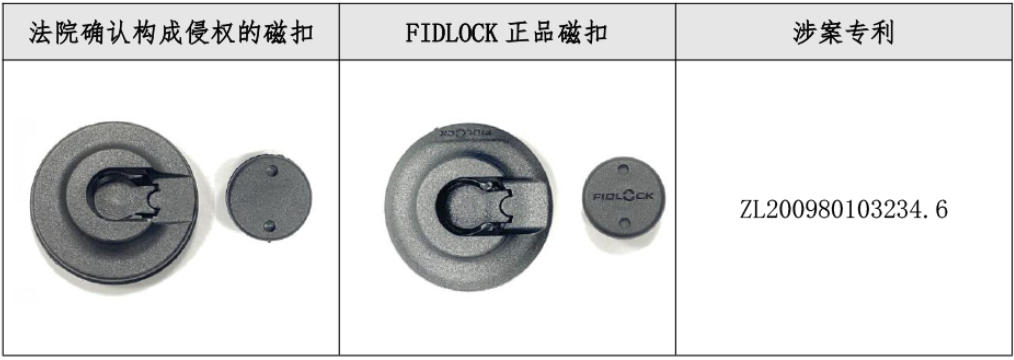 法院确认构成侵权的磁扣与FIDLOCK正品磁扣的比对情况如下: