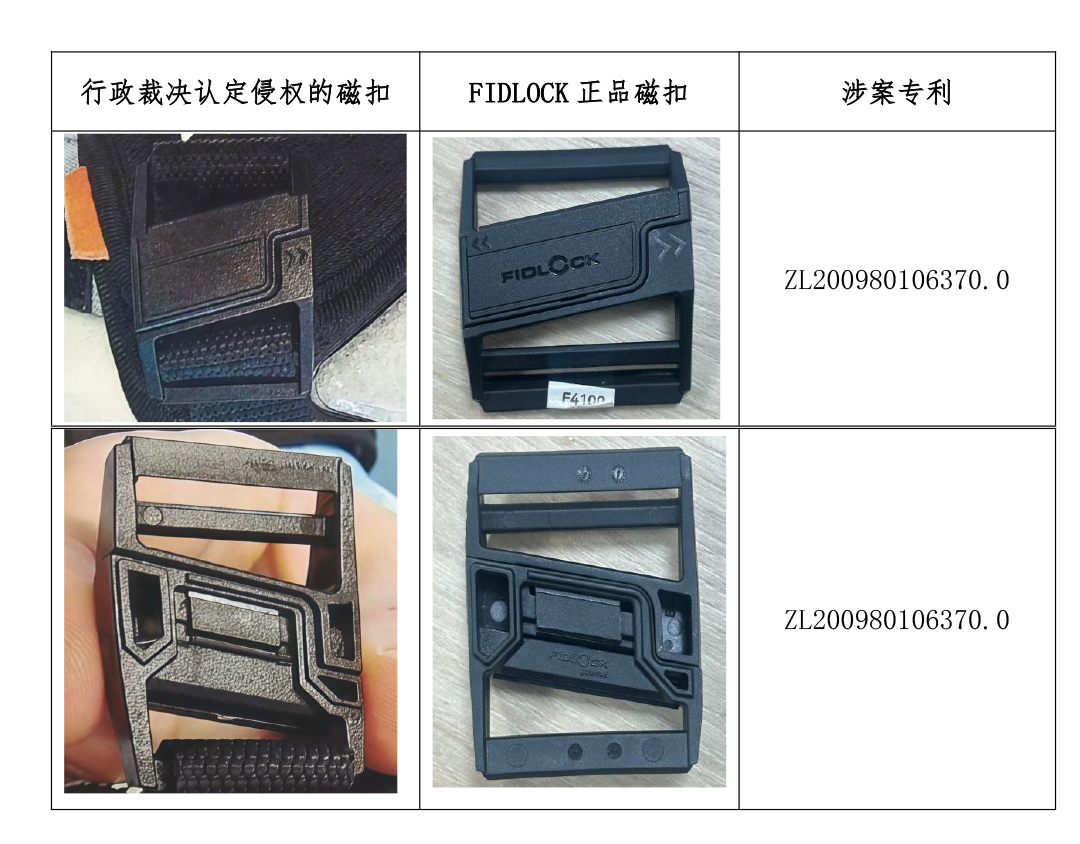 泉州市丰泽区市场监督管理局确认构成侵权的磁扣与FIDLOCK正品磁扣的比对情况如下: